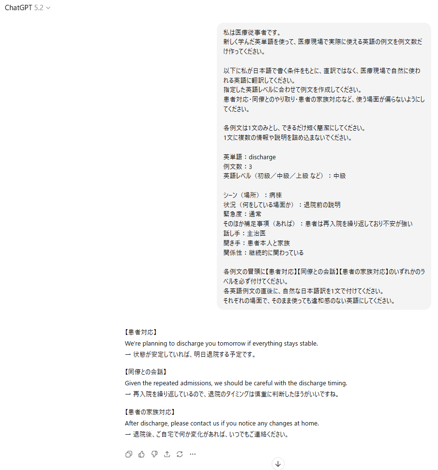 医療英語の書籍やウェブサイトで紹介されている例文が使いこなせないなら、自分が日常的に言うことを日本語で書きだして、ChatGPTに英訳してもらいましょう。